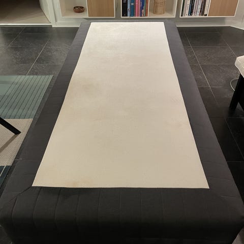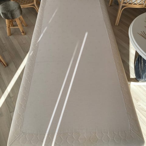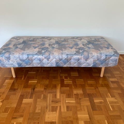 Boxmadras, b: 90 l: 210, ok boxmadras på formspændte meder i lyst træ.