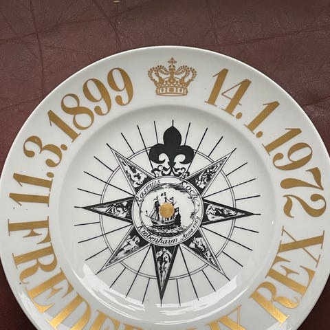 -Sladrekompas fra Kongeskibet Dannebrog. Platte med motiv af Sladrekompas fra kongeskibet Dannebrog. Udsendt i begrænset antal til erindring om hans majestæt Kong Fredrik IX. Bing og Grøndahl. Diameter 24,5 cm. Velholdt.