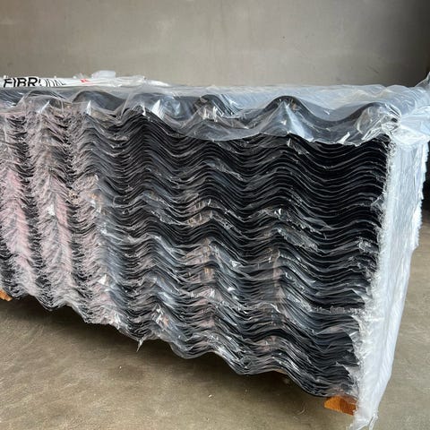 Eternit bølgeplader, B6 plader, hvide/grå, 19 hul/hjørne samt 2 stk med mindre skade. Har også nogle sorte, ca. 10 stk. De har aldrig været monteret men har stået nogle år. Nogle få har lidt skrammer og er lidt beskidte, men ellers i fin stand.