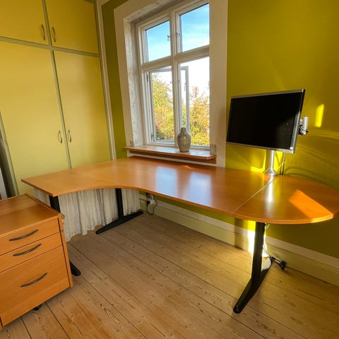 Sælger et unikt og alsidigt skrivebord med fleksibel indretning. Perfekt til hjemmekontoret eller til dig, der sætter pris på en rummelig og justerbar arbejdsplads.
