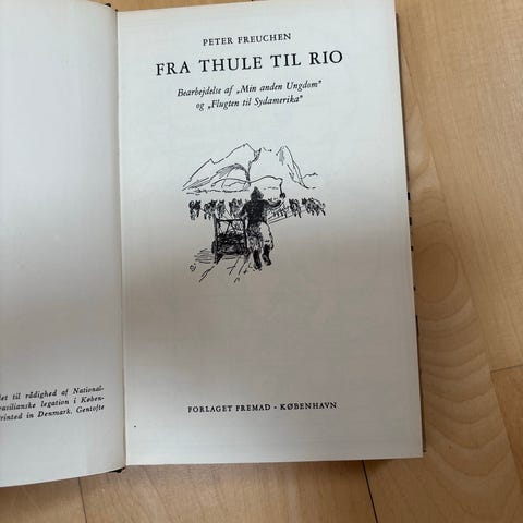 I al frimodighed. Erindringer I, Af Peter Freuchen, 1953. 250 sider, ill, hft. - brugsspor – Fra opvækst til samarbejde med Knud Rasmussen, oprettelsen af Thule-stationen, dagligdagen mellem eskimoerne o.m.a. – ” Peter Freuchen; Danmarks store opdagelsesrejsende og polarforsker. Fabulerende, vilde historier, barske naturoplevelser og en umættelig eventyrlyst fylder hans erindringer og tegner portrættet af et unikt menneske med en høj moral. ” Grønland