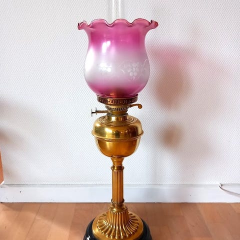 Denne smukke og klassiske petroleums-lampe er et charmerende stykke nostalgi, der bringer varme og hygge til ethvert rum. Med sin solide messingbase og hvide, glatte glaskuppel skaber den en unik atmosfære, perfekt til at skabe en gammeldags stemning i dit hjem.