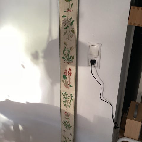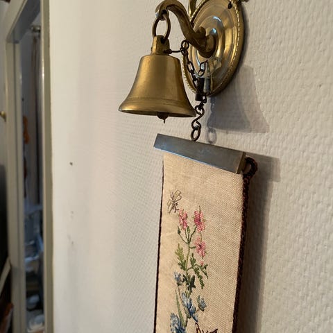 Meget fin klokkestreng fra Eva Rosenstand med drue og vin-motiv. Klokkestrengen har ligget sammenrullet og har aldrig været hængt op. Den er forsynet med sålydende etiket: