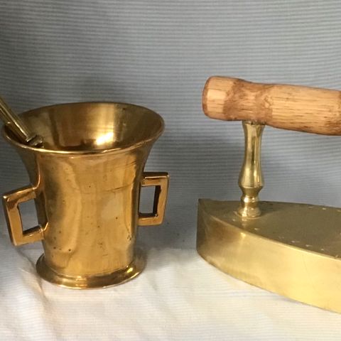 Redskaber fra 1800 , Messing, 175 år gl., messing rivejern og morter fra start 1800 tallet. meget smukke . Pudses de skinner de smukt . Begge i god stand. Sælges samlet for 275 kr