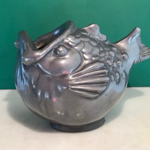 Flot, patineret figur med stor og lille fisk i diskometal.