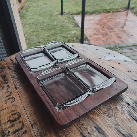 Glas, Kaberat fad på teaktræsbakke, Ukendt, Kaberat fad på teaktræsbakke med 4 glas bakker smoke – Ø-34 x 15cm