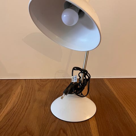 Skrivebordslampe, Flot bordeaux-farvet bordlampe med 190 cm hvid stofledning. Velholdt og med minimale brugsspor. Højde ved stander 62, total 70