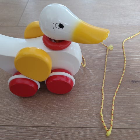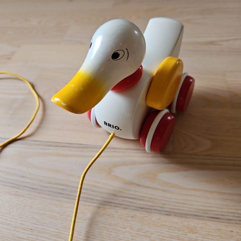 Træk-and, Brio and i rigtig flot stand. Ældre model. Siger lyde, når man trækker den.