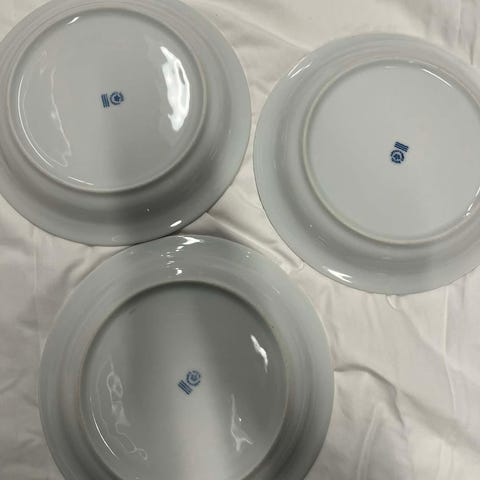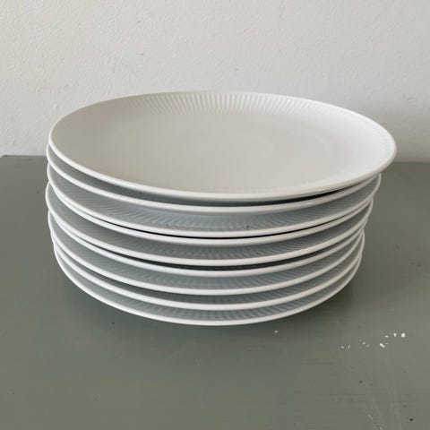 7 hvide små tallerkner fra Royal Copenhagen, nr. 617, dia 18 cm (alle med lille skår under kanten). Samlet 350 kr
