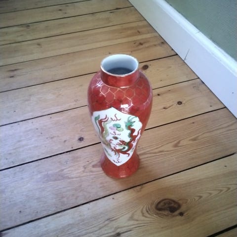 Vase, 23 cm høj. Der er et mærke på, hvor der står “Tao-Kwang 1821-1850”. Om det er korrekt, aner jeg ikke, men det var en rimelig dyr vase, min svigermor i sin tid fik.