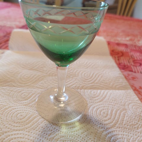 Glas, Vinglas, Holmegaard, "Ejby" Hvidvinsglas med Lysgrøn Kumme. Holmegaard. 12 cm H. Designet af Jacob E. Bang for Holmegaard i 1937.