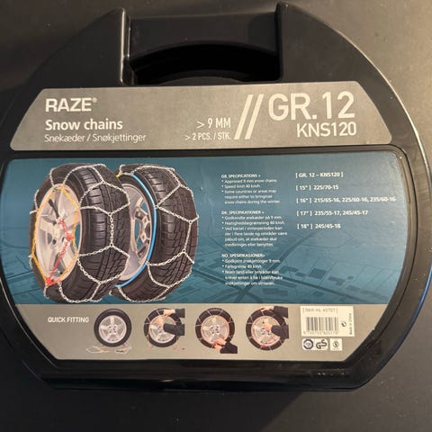 Snekæder, RAZE, Har været brugt 3 gange i Østrig. Nemme at tage på og af. Passer til dækstørrelse 225/55/17. Har siddet på min BmW 5 serie.