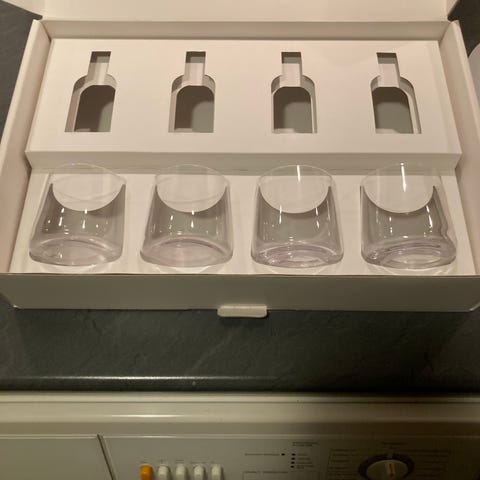 Det er mundblæste krystalglas med en let buet bund, der gør at glassene kan vippe lidt. Aldrig brugt.