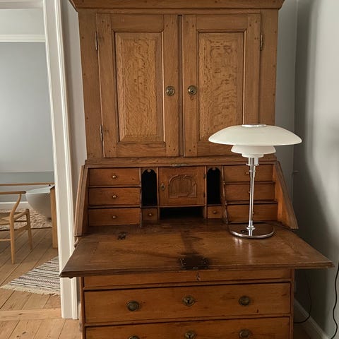 Fremstår i rigtig fin og flot stand, naturligvis med tidens patina. Alle skuffer er originale, nøgle medfølger. Eneste mangel er en enkelt skuffeknop.