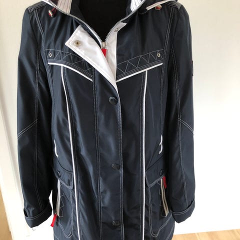 Store sorte knapper foran - høj rynket krave - lange dobbelteribkanter i ærmerne - sidelommer