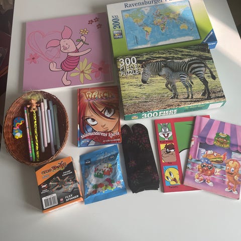 Små puslespil. Blyanter, gym. Pose, pung, kridt, madkasse, kryds og bolle, kopper mm.