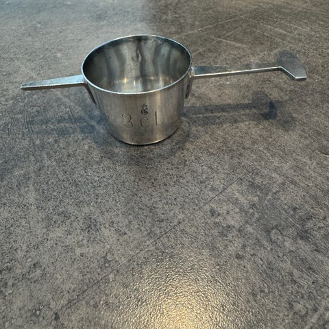 MEGET GAMMELT OG BRUGT/SLIDT DRINKS MÅL , SALLING, Det gamle drinks mål med brugsspor efter utallige års brug, er på håndtaget præget SALLING - stemplet nedenunder med DFA. Gammelt og massivt. 3,5 cm højt og 4,5 cm i diameter.