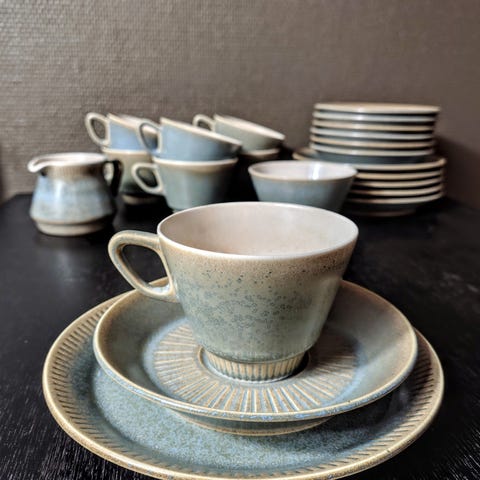 Keramik, Tekop og underkop, Knabstrup keramik, Nøddebo, I fin stand uden skår/hakker. Tekopperne måler 10 cm i diameter og underkopperne måler ca. 15 cm i diameter. Har 7 tekopper og 9 underkopper.