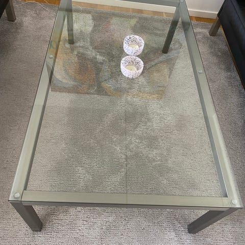 Sofabord, metal, b: 40 l: 120 h: 42, praktisk og flot glasbord med massiv glasplade. Enkelte små hakker. Kun afhentning. Købt i år 2000 for 6000