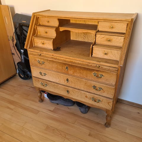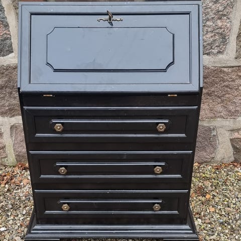 Den har 3 store skuffe og to mindre. Derudover er der selvfølgelig en klap så det også kan bruges som skrivebord.