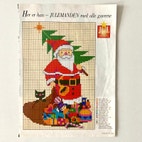 Nogle sider fra ugebladet Femina (Nr. 44 1966) med broderi mønster / tælle diagram samt arbejdsgang til en pakkekalender med nostalgiske julemand med gaver og juletræ broderet med uldgarn i korssting.