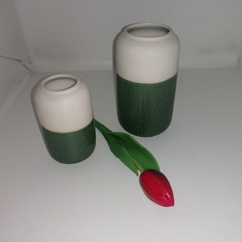 Lille ottekantet keramikvase m/løbeglasur i hvid/beige/brun glasur.