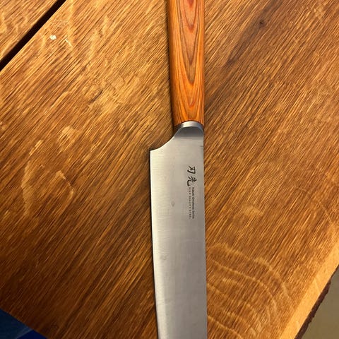 Elegant og præcist udført japansk frugtkniv fra Suncraft Japan, en producent kendt for sine kvalitetsknive fra Seki-regionen – Japans historiske knivhovedstad. Kniven har en total længde på 21 cm inklusive den originale lakerede træskede, og selve bladet måler cirka 9,5 cm. Det er fremstillet i rustfrit stål og egner sig særligt godt til finere udskæringer af frugt og grønt.