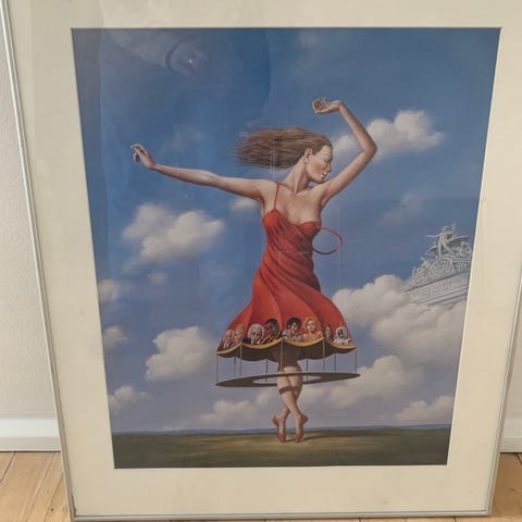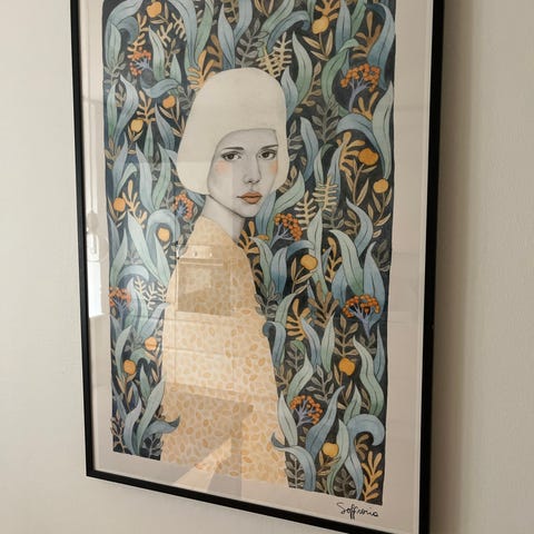 Plakat, Baya Mahieddine, motiv: Woman and child in blue, b: 67 h: 43, Plakat af et billede malet i 1947 af Baya Mahieddine. Billedet hedder Femme et enfant en bleu (Woman and child in bllue). Plakaten er købt i Frankrig, og er indrammet i Danmark af glarmester med aluminiumsramme og klart glas. Billedet kan beses i Brønderslev.