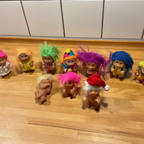 Damtrold , højde ca 18 cm , mellemlangt hvidt hår, original ældre Thomas Dam 1977, Made in Denmark, Nissetrold med strikket nissehue , trøje med hjerte og buks , pæn stand enkelte sorte pletter på bagside - se foto - ikke ryger hjem