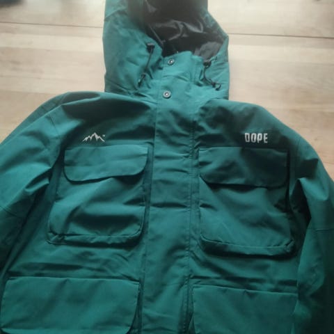 Jakken har mange detaljer - snefang til bukser og i ærmer, ventilationslynlåse under armene, lomme til liftkort, net til handsker/i højre inderside og stor lomme i venstre inderside. Mange ydre lommer og venstre øverste lomme til mobil har indvendig udtræk til høretelefoner, så de ikke hænger fast i ting. Ny pris 2200kr (ny lynlås 200kr)