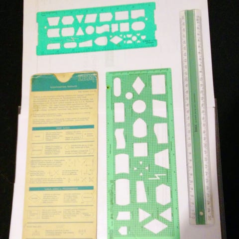 IBM flow charting skema lineal med de forskellige huller og så er der på sleevet forklaringer af symbolerne. Fragt 44kr GLS