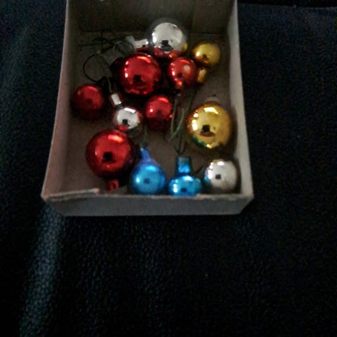 Julekugler, Smukke gamle antikke julekugler i æsker til at hænge på træet, samt en kurvfuld løse.