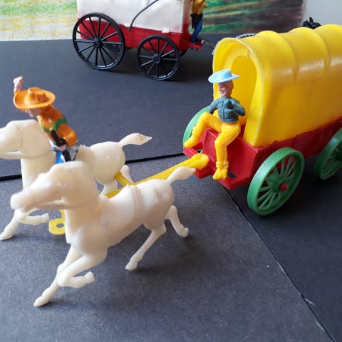 Legetøj, Vintage western figurer fra 1970’erne, 1 hestetrukken vogn med 2 heste, 1 tipi (teepee) med indianer, 5 heste med ryttere og 6 mennesker. Hestevognen er 19 cm lang. Alt er meget velholdt.