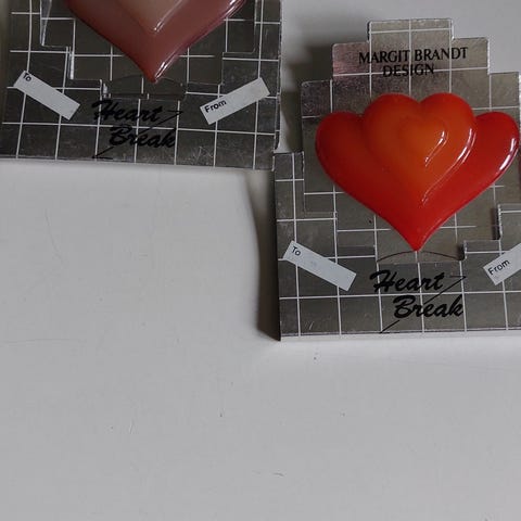 Broche, plast, Margit Brandt hjerter 200 kr pr stk svaner 350 kr pris stk