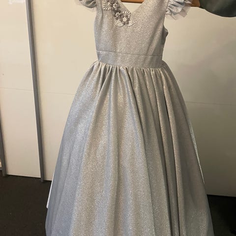 Kjole, Festkjole/gallakjole, /, str. 122, Denne elegante kjole blev brugt 1 gang. Den har fine detaljer på brystet, som mange piger vil elske. Derudover har den en stor flot sløjfe bagved. Den har stropper på skulder og tyl langs armene. Er ca en 122/128.