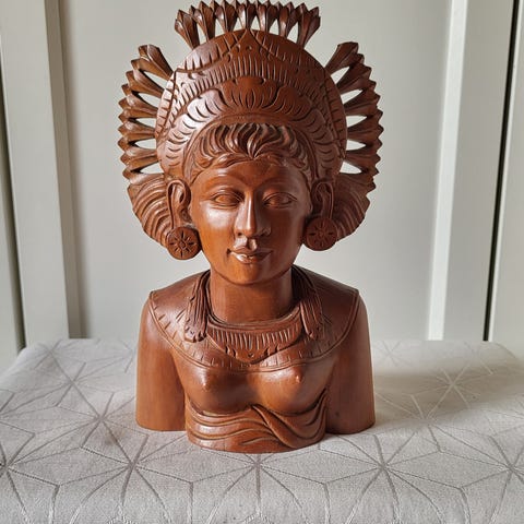 Balinesiske figurer, Vintage buster, håndskåret i tropisk ædeltræ. Fra Bali i slut 1940’erne. Højde 23cm, bredde 14cm.