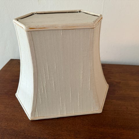 Lampeskærm, Lampeskærm sekskantet i råhvidt stof med beige bagside. Brugt, men meget flot stand. Fra røg- og dyrefrit hjem. Måler i toppen på tværs 24 cm. Højden er 28 cm. Skærmen giver et varmt lys. Nypris er ca. 1600-1800kr.