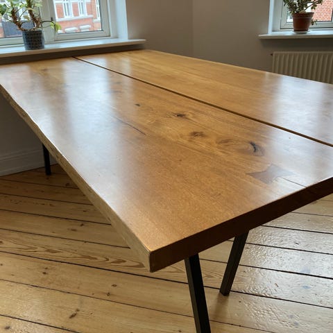 En hel planke der måler 242 cm i længde. Den ene ende er 77 cm bred og den anden ende er 112 cm bred. Planken er 7 cm tyk, virkelig en lækker bordplande.