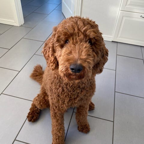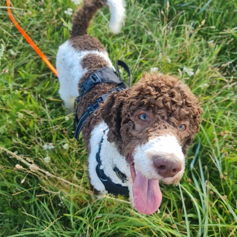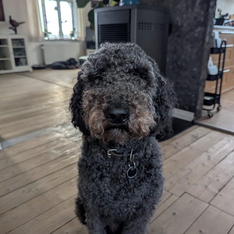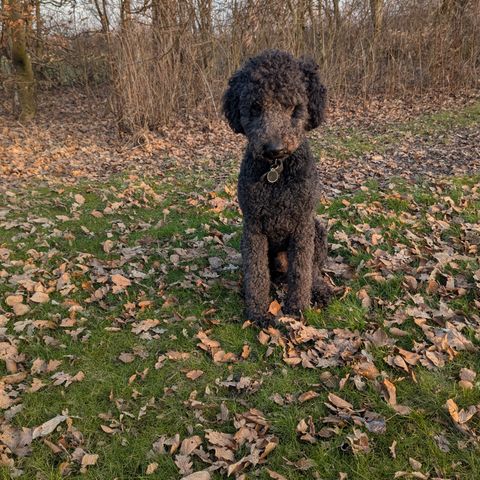 Han elsker at køre bil. Han har gået til hunde træning det gik godt. Han har rigtig tætte puddel krøller.