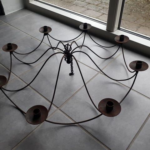 Lysekrone, Smuk vintage lysekrone til stearinlys. Patineret hvid i træ og jern. H. 80 cm, b. 95 cm, vægt ca. 6,5 kg.