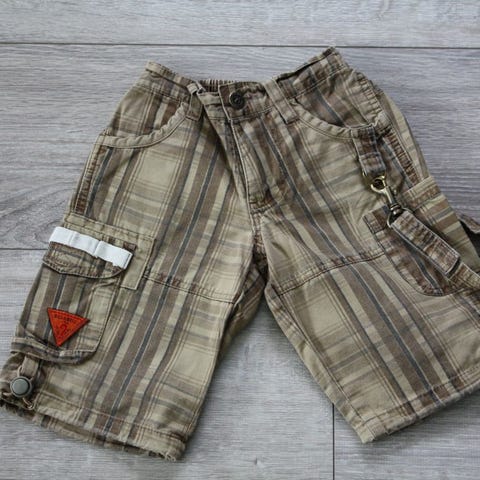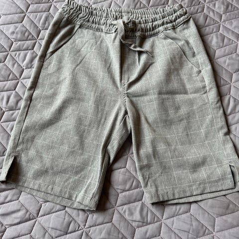 Shorts str. 146 lysegrå og sort, tyndt sweatstof. Elastik og bindebånd i taljen. 1 baglomme. 84% bomuld, 16% polyester. Pæn stand. Ann. nr. P730