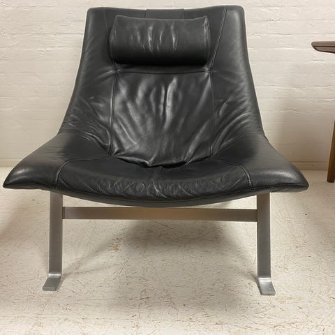 Hvilestol i sort læder med stel af matforkromet fladstål. Model “Nest”. Tilhørende fodskammel. Aftagelig nakkepude. Fremstillet hos Nelo.