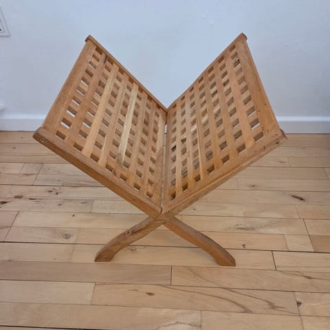 Magasinholder, Retro avisholder, bladholder, magasinholder eller til opbevaring af LP’er. I metal med træhåndtag. Har en del slid, lidt rust og mangler en dut på det ene ben. Men den er god stabil og dekorativ. Totalhøjde 57 cm, 37 cm lang og 16 cm dyb. Sendes ikke, men kan hentes på adressen.