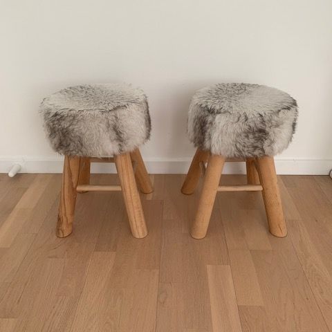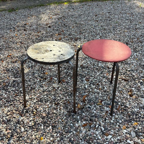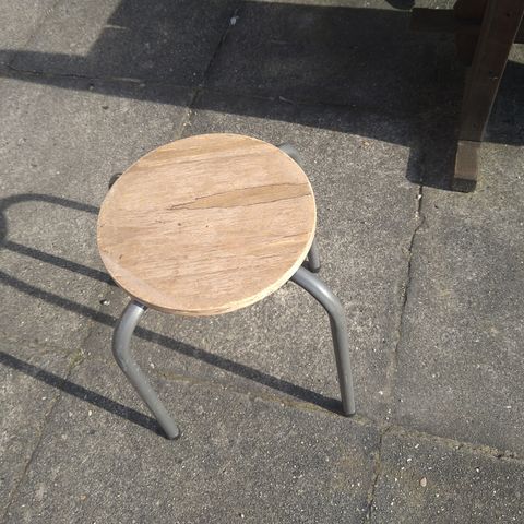 taburetter med teaksæde og brune ben i metal, sælges for 150 kr. stykket.