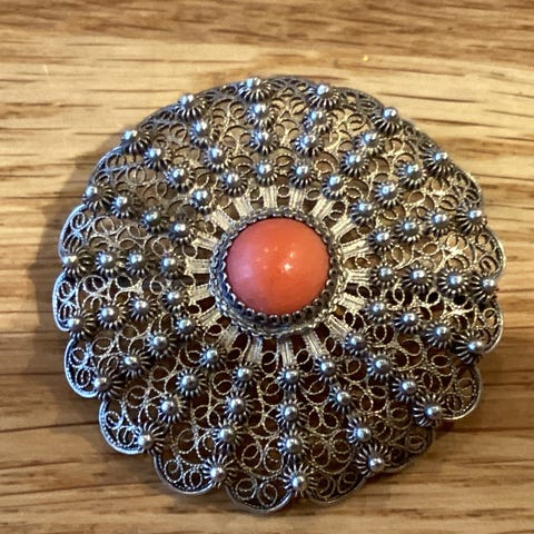 Broche, sølv, Chr.J, Antik broche skønvirke 830S Chr.J(1915-1937) med to stykker rav.længde:7cm b:4cm