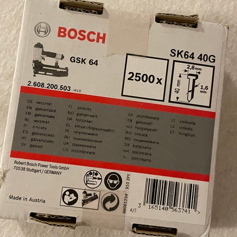 Bosch 18 v. sømpistol købes, med eller uden lader/ batterier.
