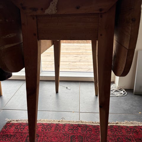 Spisebord, Laminat, Fransk vintage, b: 59 l: 140, Fransk vintage bord med udslået klapper her på foto, er perfekt til lille lejlighed, sommerhus, Kolo eller andet. Det er fra mine bedsteforældre i Frankrig og i rigtig pæn stand. Farven er mat orange. Bordpladen er i laminat. Nemt at holde og tørre af.