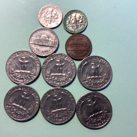 Sæt af 5 forskellige plastik mønter benævnt school money
