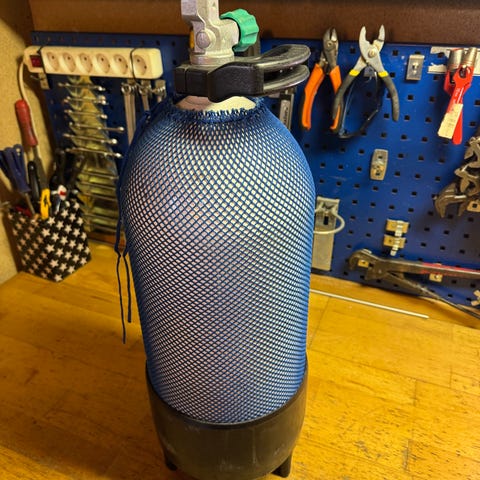 10 L. Stålflaske, 10 L. Stålflaske m. Fod og ventil. Står med tryk.