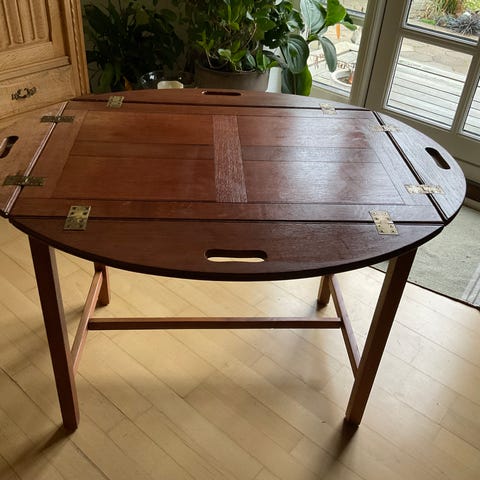 Smukt gammelt rullebord / bakkebord / sidebord / serveringsbord i jern og flot mørk finér.